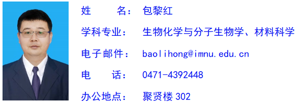 包黎红,男,蒙古族,生于1983年,祖籍内蒙古科右中旗,工学博士,教授,博士生导师。内蒙古电子显微镜学会理事。内蒙古自治区“草原英才”。先后入选内蒙古自治区“青年创新人才”一层次、内蒙古高等学校“科技领军人才”。长期从事纳米稀土硼化物、过渡金属硼化制备、表征、光电催化性能及光热疗特性对生物杀菌方面研究。发表高水平学术论文 32 篇。主持国家自然科学基金项目 2 项,内蒙古自然基金项目 1 项,内蒙古自治区自然科学基金杰出青年项目 1 项。获 2019 年度内蒙古自治区自然科学三等奖。