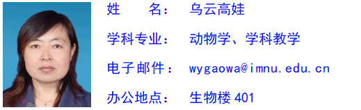 乌云高娃,女,蒙古族,1968年1月出生,内蒙古赤峰市阿鲁科尔沁旗人,硕士,高级实验师,硕士研究生导师。现任bv伟德国际1946教师。1986年9月—1990年7月就读于bv伟德国际1946,获理学学士学位;2003年9月—2006年7月就读于bv伟德国际1946,获理学硕士学位。1990年8月—2003年9月在赤峰市阿鲁科尔沁旗任教;2006年7月来bv伟德国际1946任教。2001年9月晋升为讲师,2014年12月晋升为高级实验师。承担“人体及动物生理学实验”、“ 无脊椎动物学实验”、 “昆虫学”、“中学生物学教学设计”、“中学生物学课程标准与教材研究”、“ 中学生物学课堂教学理论与实践”、“ 中学生物学教学技能训练”、“动物学野外实习”、“教育实习” 等课程的教学工作。主要从事害虫防治及昆虫分类、学科教学论研究,主持和参加国家级、省部级项目多项;和他人共同主编教材1部、参与教材编写2部、参与编写专著2部;发表学术研究论文多篇。多次获得bv伟德国际1946本科生教学技能大赛“优秀指导教师”荣誉称号。