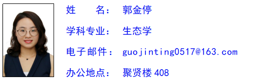 郭金停,女,汉族,中共党员,博士,副教授,学术型硕士研究生导师。教学实践管理中心主任兼生态学系副主任。目前主要从事生态遥感、生物多样性保护等领域的研究工作,主持国家自然科学基金地区项目1项,教育部产学合作协同育人项目1项,内蒙古自治区自然科学基金项目1项,发表高水平论文10余篇。承担本科生遥感与地理信息系统、普通生态学、生物统计学等课程的教学和专业实习指导,承担研究生生态学研究方法、动物生态学研究进展课程教学。