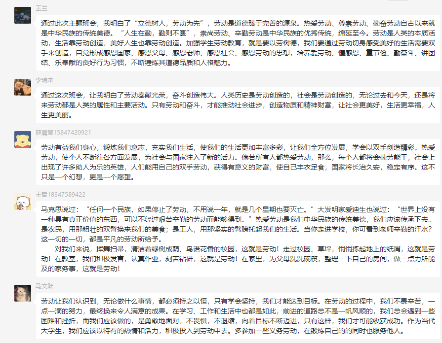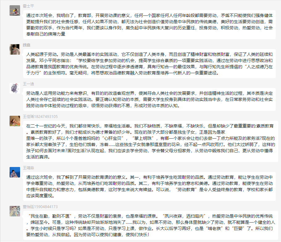 同学们在班主任的引导下,分享了自己的劳动成果,畅谈自己参加劳动的感受,大家通过劳动教育更加懂得要尊重劳动者,涵养劳动情怀,树立正确的劳动观念。