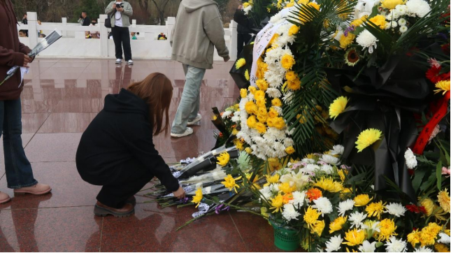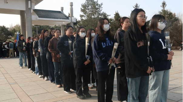 在敬献鲜花环节,同学们鞠躬致敬,依次献上白菊寄托哀思,缅怀先烈的丰功伟绩。