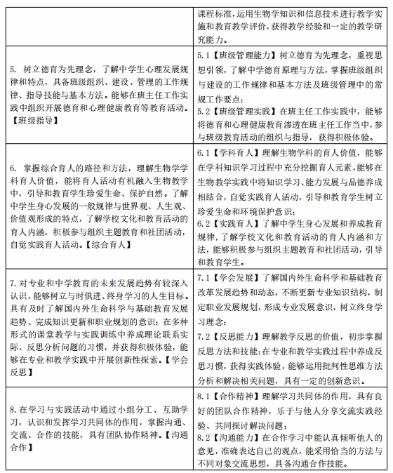 目标2:具备扎实的生物学理论基础和实验实践能力,具备先进的教育方法和教学技能,能够综合运用这些知识和技能,结合现代教育思想、教育理念和其它相关学科知识,进行生物学教学和教学资源开发等教育教学研究活动。