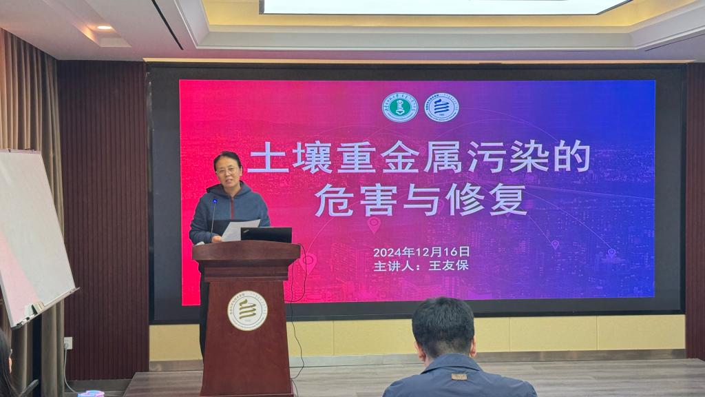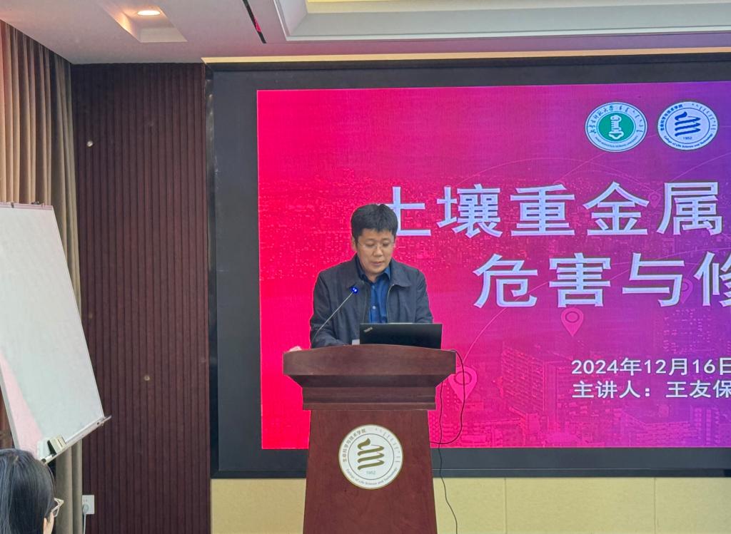 为深入探讨土壤重金属污染问题及其治理对策,促进生态环境保护相关研究的学术交流,学院于12月16日在生物楼智慧教室成功举办了“土壤重金属污染的危害与修复”学术报告会。本次报告会由院党委副书记、副院长高峰主持,邀请到了安徽师范大学生态与环境学院博士生导师王友保教授担任主讲嘉宾,本次报告会吸引了学院师生近百人参会。
