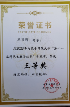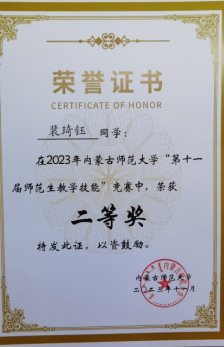 bv伟德国际1946“第十一届师范生教学技能”竞赛于2023年11月4—5日在盛乐校区隆重举行,在本次比赛中,伟德官网经过层层选拔,选派2020级生物科学汉2班的裴琦钰、许钧升和2021级生物科学蒙班的苏日娜共三名同学参加了本次技能大赛,指导教师为李景环、牛艳芳、高峰和乌云高娃。经过赛前师生的精心准备和赛场上的激烈角逐,最终裴琦钰同学获得二等奖,许钧升和苏日娜同学获得三等奖。 奖获者荣誉证书 二等奖获得者合影 三等奖获得者合影