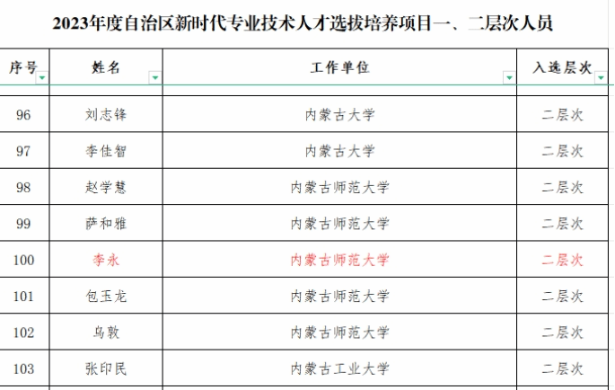 12月28日,自治区人力资源和社会保障厅公布了2023年度自治区新时代专业技术人才选拔培养项目一、二层次人员名单。按照《关于开展2023年全区“新时代专业技术人才选拔培养项目”人选选拔培养工作的通知》(内人社办发〔2023〕147号)安排部署,经个人申报及单位推荐,伟德官网李永教授入选自治区新时代专业技术人才“二层次”人才。