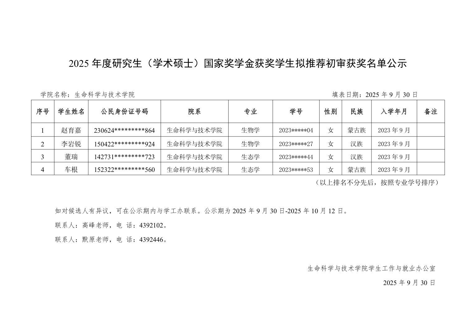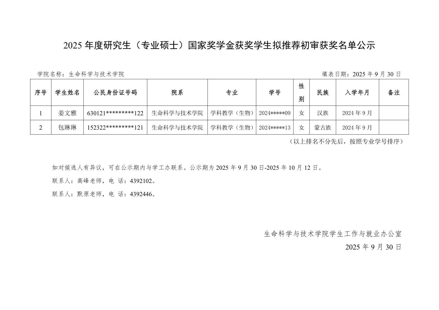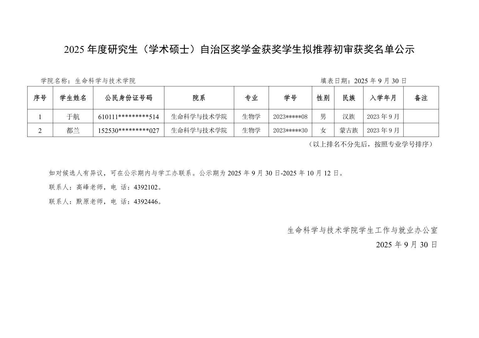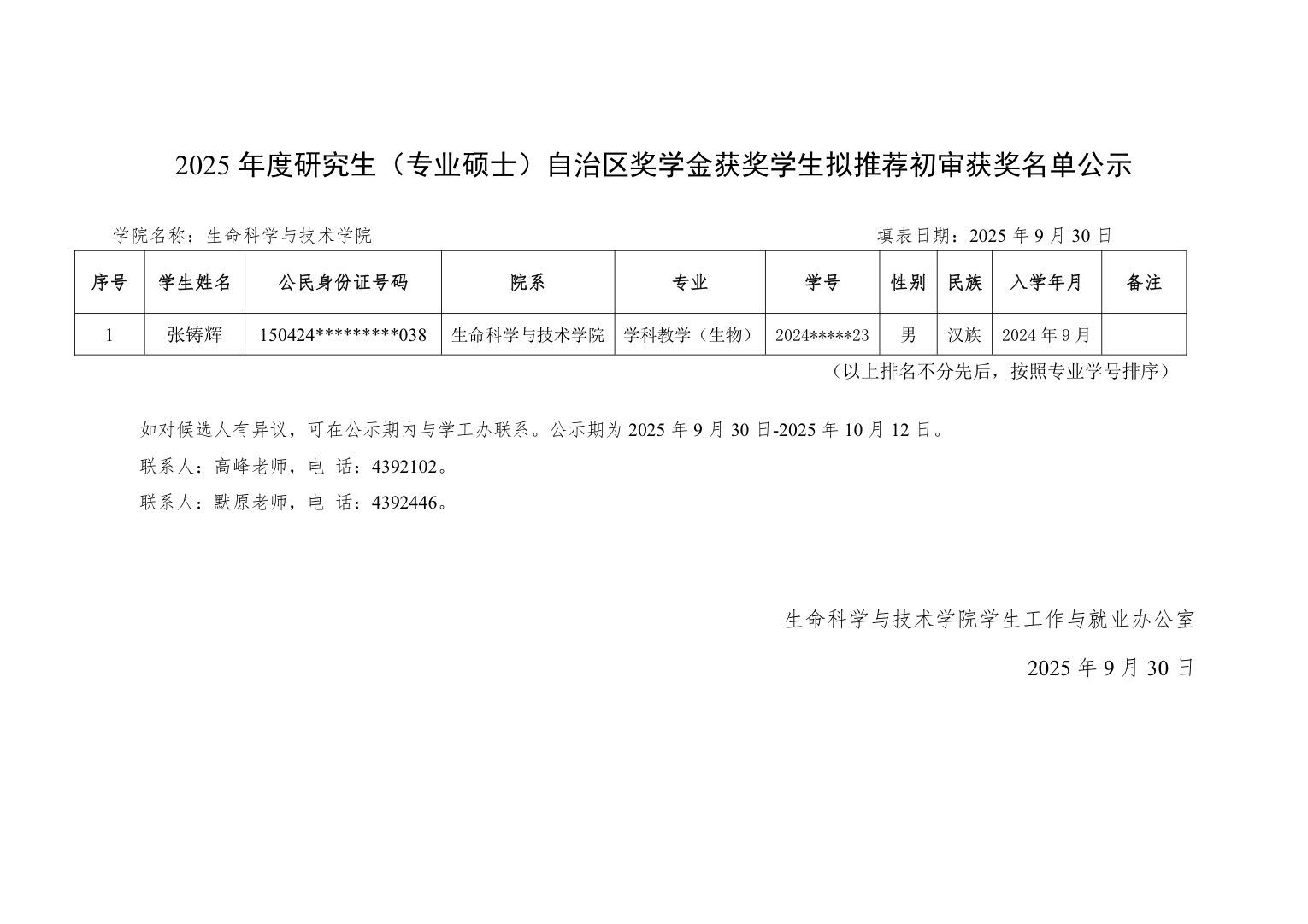 2025年度研究生国家奖学金自治区获奖学生拟推荐初审结果公示
